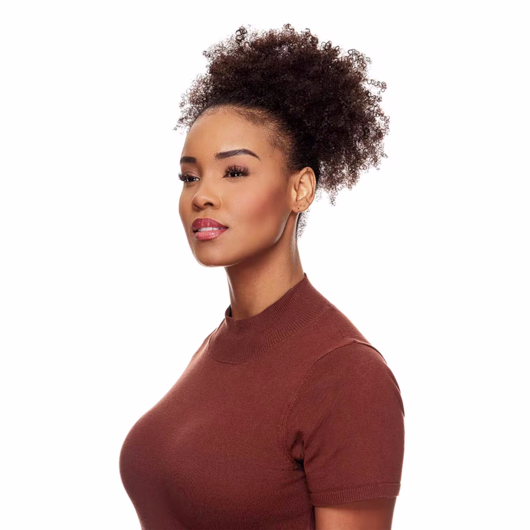 Aplique de cabelo na cor castanho escuro. De Benguela Afro Puff Kinky possibilita diversas formas de uso e variados estilos de penteado.