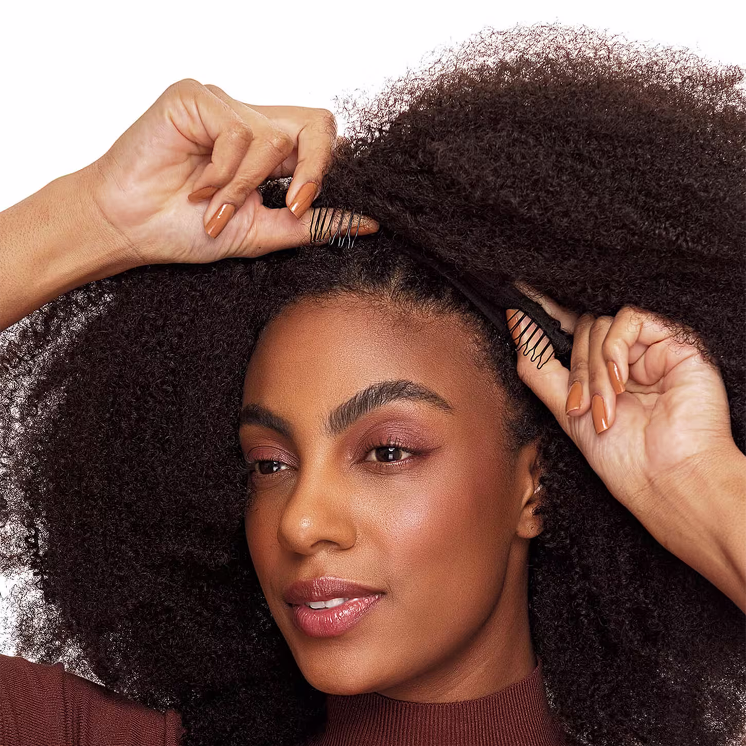 Peruca de cabelo humano cacheado na cor castanho escuro. De Benguela Coily é ideal para mudar o visual de forma rápida e prática, adicionando volume, comprimento e estilo, sem comprometer a integridade do cabelo natural.