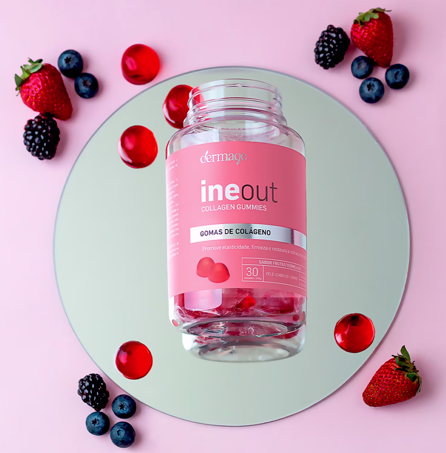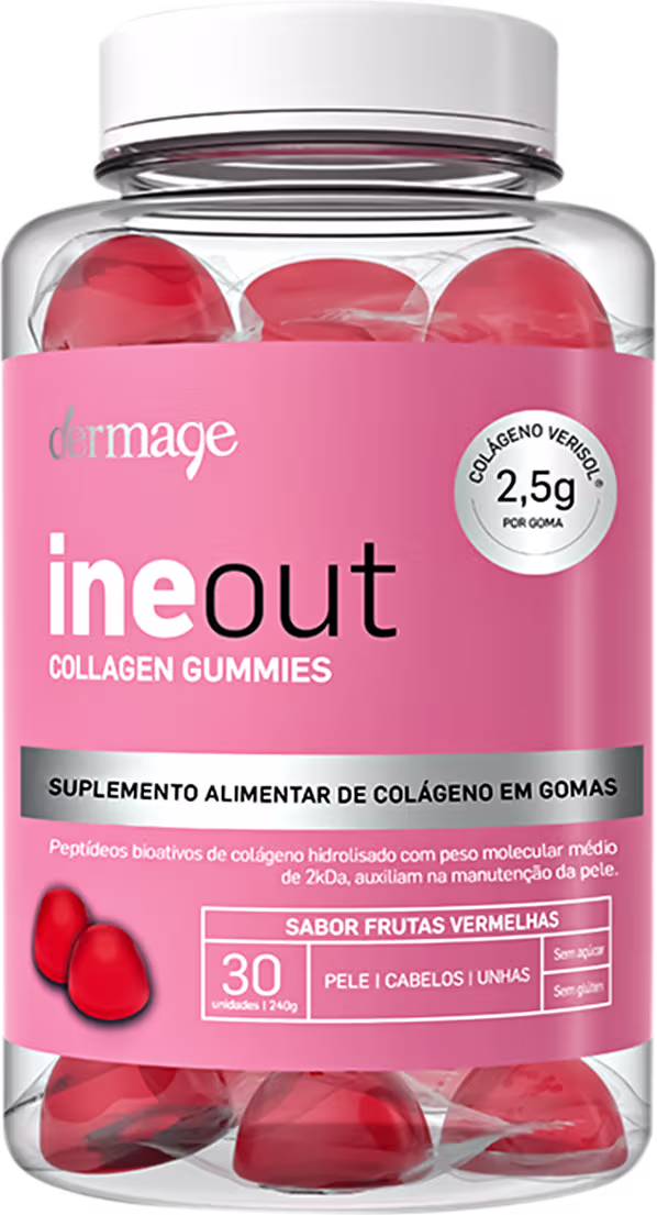 O Colágeno em Gomas Dermage Ineout Collagen conta com 2,5g de colágeno Verisol® em cada gominha, promovendo elasticidade, firmeza e redução no volume de rugas, além de ajudar no crescimento e fortalecimento das unhas. Tudo isso em gomas com delicioso sabor de frutas vermelhas e livre de glúten e açúcar.