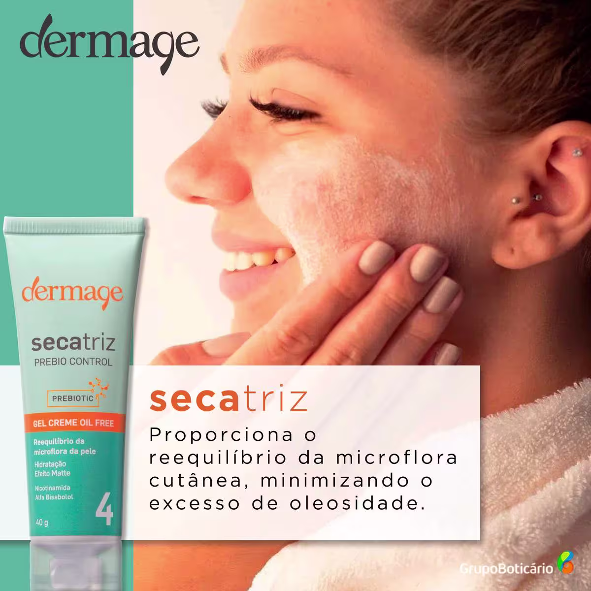 O hidratante Secatriz Prebio Control, de Dermage, possui textura leve e não oleosa que hidrata e reequilibra a microflora da pele acneica. Sua fórmula conta com tecnologias que reduzem a produção de sebo e evitam inflamações que podem causar espinhas, além de disfarçar cravos e poros dilatados. Deixa sua pele refinada e luminosa, mas sem excesso de brilho.