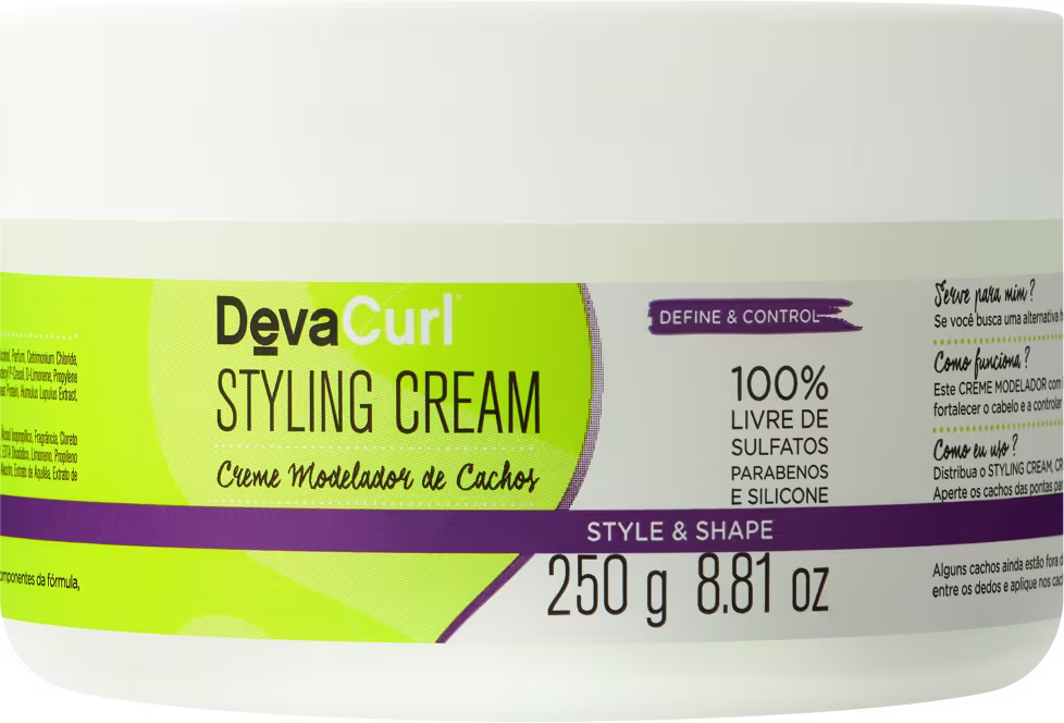 Creme modelador para cabelos cacheados. Deva Curl Styling Cream mantém os cachos naturalmente definidos, protege do frizz e hidrata.
