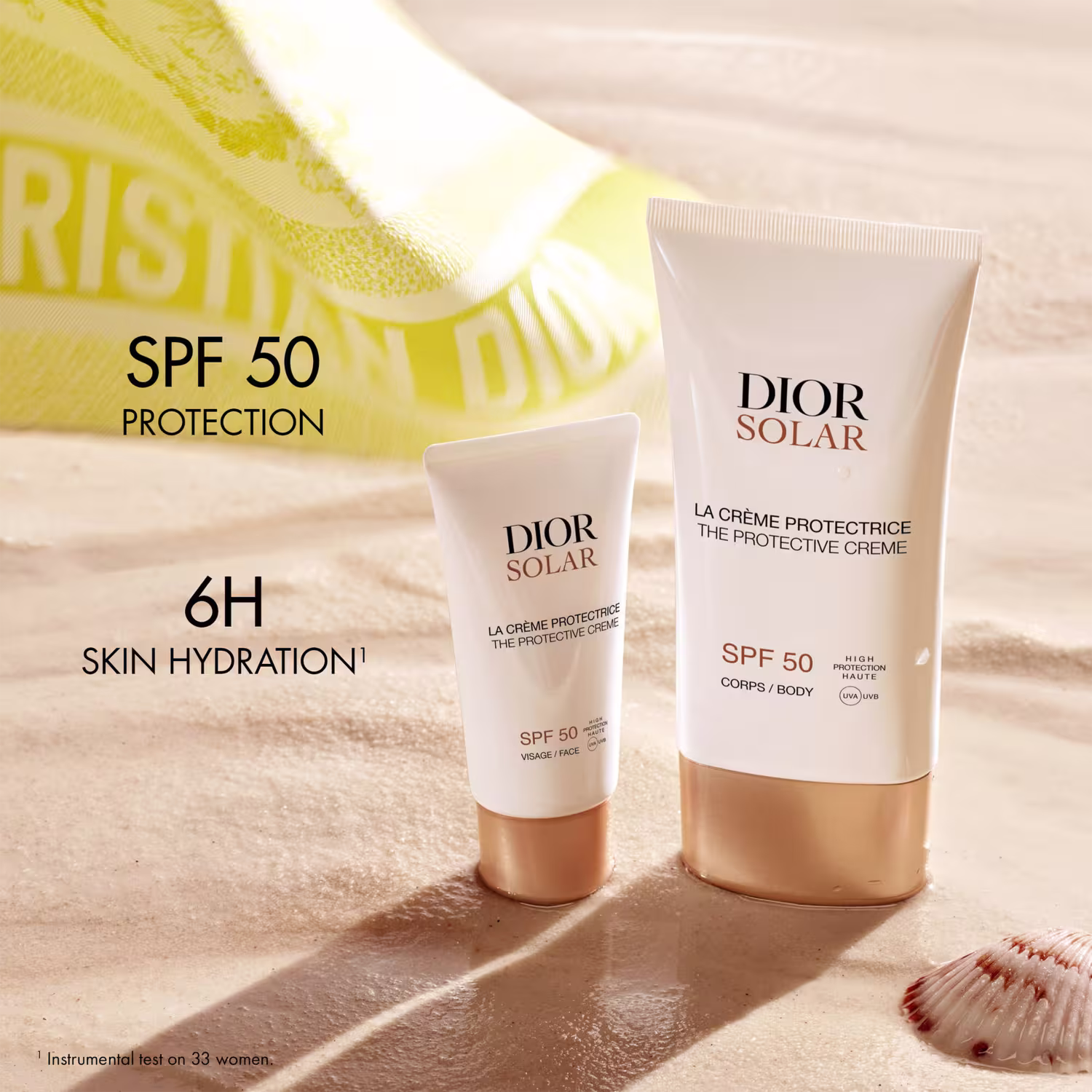 Mas a proteção não se limita à segurança. Dior Solar La Crème Protectrice oferece uma experiência sensorial única. Sua textura leve e sedosa se funde à pele, deixando um toque aveludado que a hidrata sem deixar resíduos oleosos ou manchas brancas. Notas delicadas de Monoi, um elixir ancestral de beleza, envolvem a pele em um aroma suave e sofisticado.