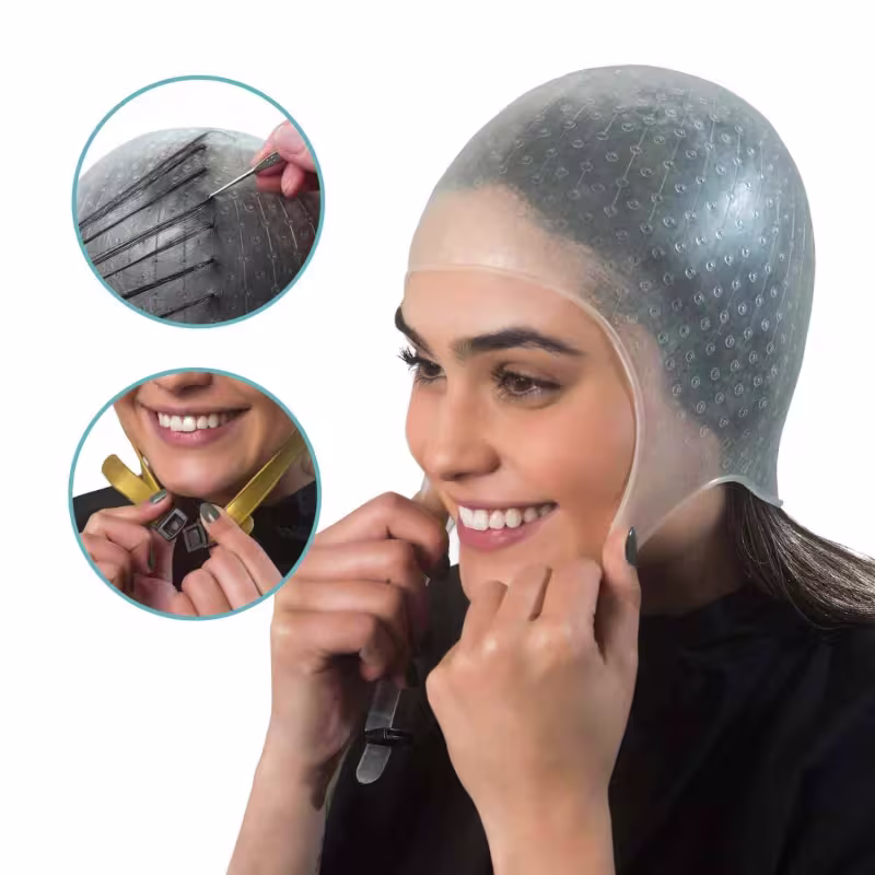 A Touca para Mechas Dompel Atenas apresenta um Silicone de alta qualidade, responsável por criar aderência ao couro cabeludo, evitando manchas na raiz dos fios.