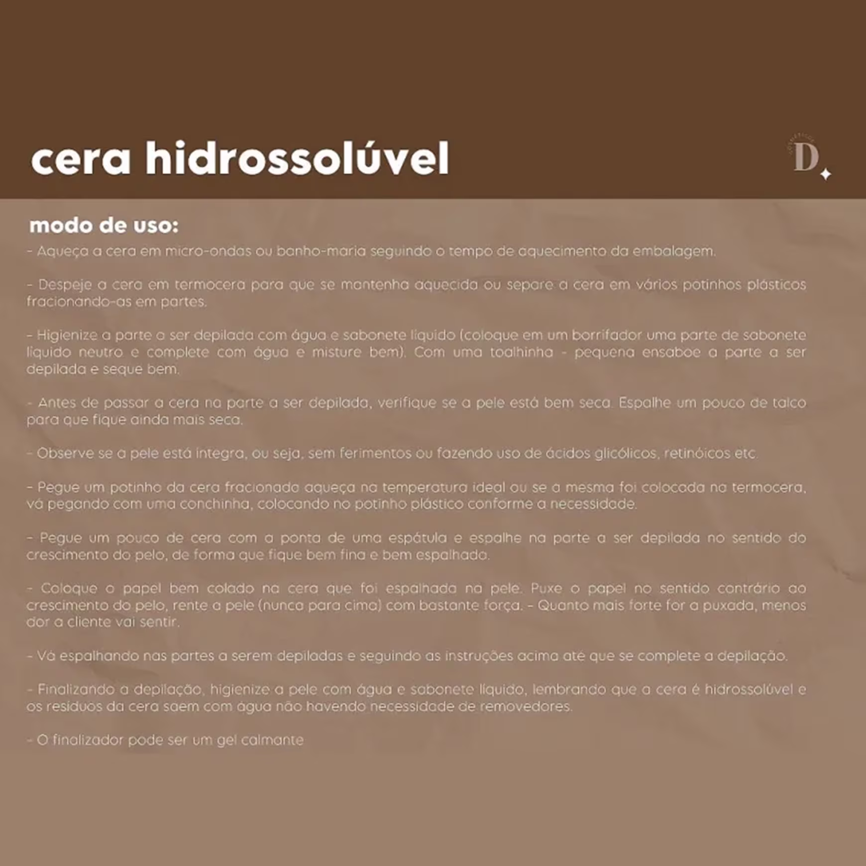Cera depilatória. Dona Pele Hidrossolúvel Chocolate proporciona uma depilação eficiente com benefícios adicionais para a saúde e beleza da pele.