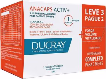 O Suplemento Alimentar Ducray Anacaps Activ+ os ativos encontrados na fórmula ajudam a manter os fios saudáveis, além de evitar a quebra e deixar as madeixas e unhas mais belas.