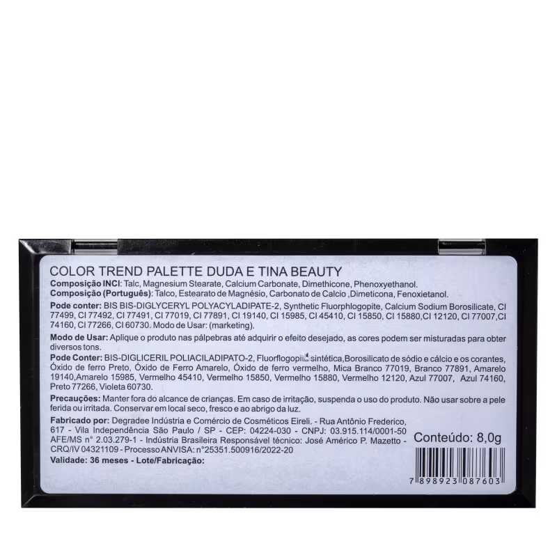 Paleta de sombras com 8 cores. Duda e Tina Vegan Beauty Color Trend reúne tons essenciais para criar diversos looks incríveis.