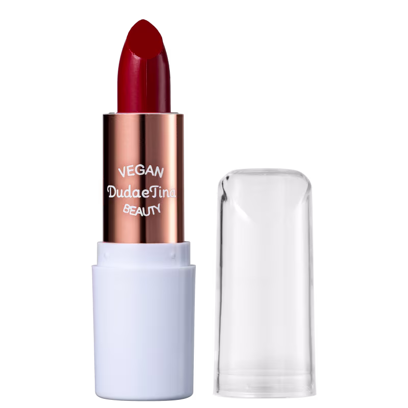 Batom matte. Duda e Tina Vegan Beauty possui uma cor intensa, com alta cobertura e longa duração.
