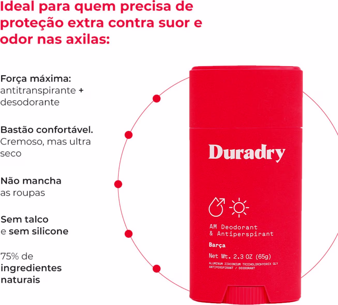 A Duradry é uma linha de desodorante antitranspirante que mantém homens e mulheres secos e confiantes o dia todo. Ideal para quem tem hiperidrose ou suor excessivo. Os produtos contém ingredientes ativos seguros, comprovados e de origem natural. As fórmulas são concentradas, e entregam força máxima para maior proteção contra o suor e o mau odor. Ingredientes 75% naturais. Vegano e cruelty free. Indicado por dermatologistas americanos. Se você está cansado de se sentir envergonhado ou constrangido com a transpiração intensa, experimente Duradry!