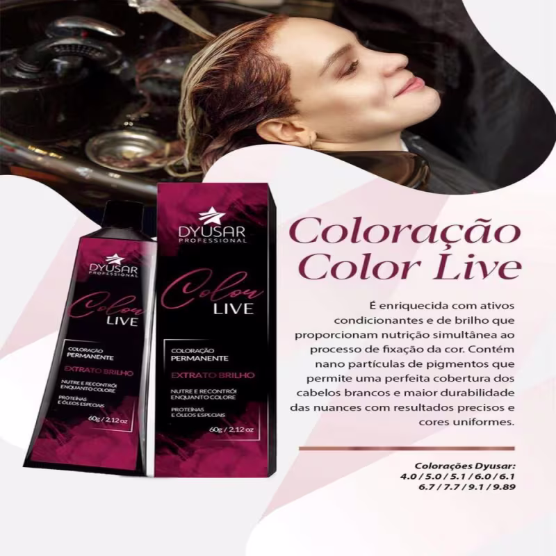 O Coloração Permanente Dyusar Color Live conta com nano partículas de pigmentos que conferem uma cobertura perfeita dos fios brancos, além de maior durabilidade das nuances. Resultado uniforme e de longa fixação.