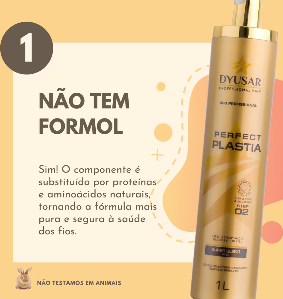 A Escova Progressiva Dyusar Perfect Plastia conta com uma fórmula enriquecida com Ácidos Hialurônico, Lático, Glicólico, Salicílico, Lipoico e Ascóbico, que juntos agem na cutícula, reestruturando a fibra capilar. Fios mais disciplinados, resistentes e maleáveis.