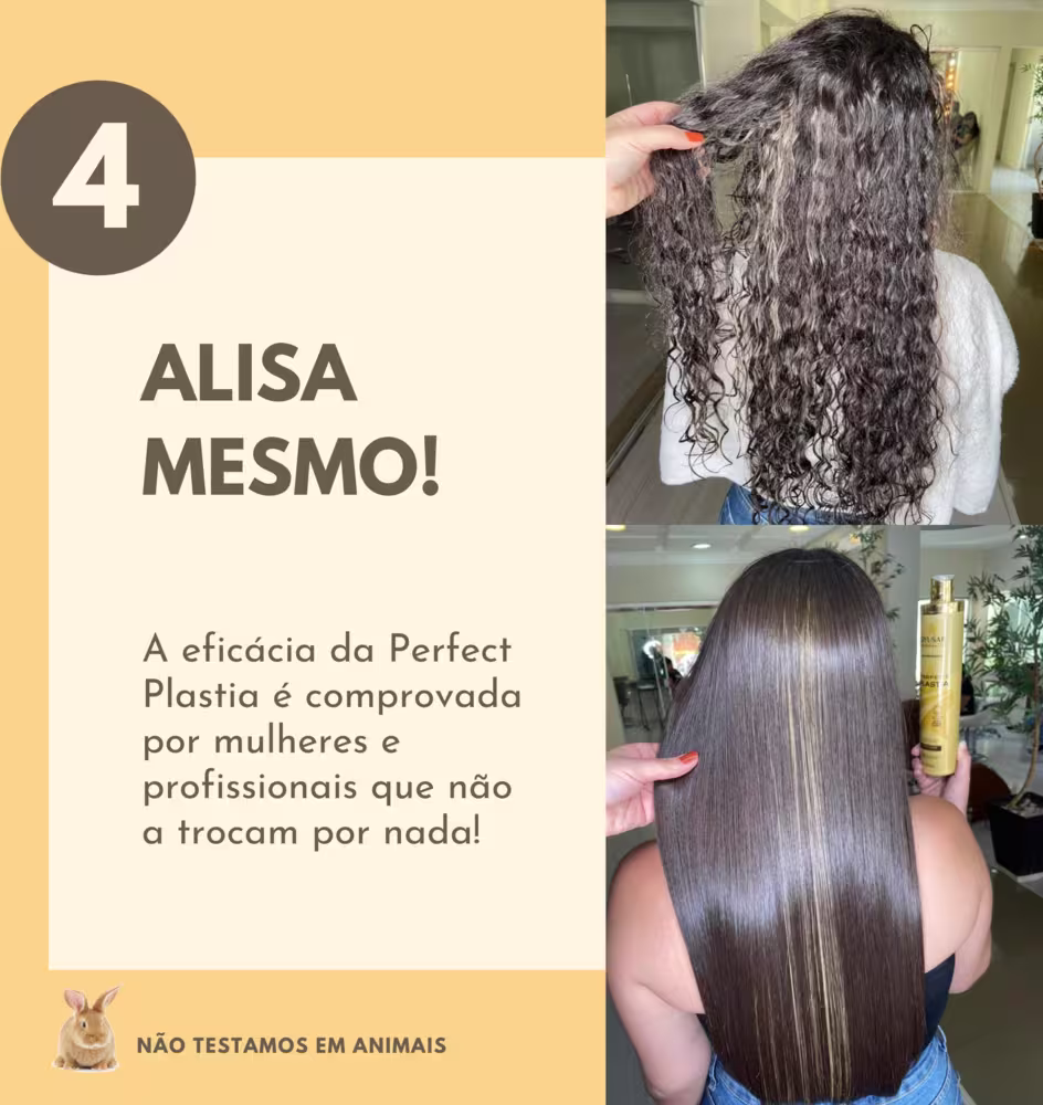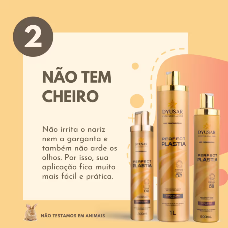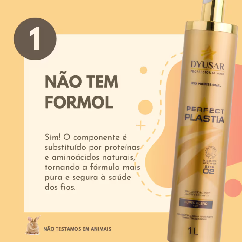 A Escova Progressiva Dyusar Perfect Plastia conta com uma fórmula enriquecida com Ácidos Hialurônico, Lático, Glicólico, Salicílico, Lipoico e Ascóbico, que juntos agem na cutícula, reestruturando a fibra capilar. Fios mais disciplinados, resistentes e maleáveis.