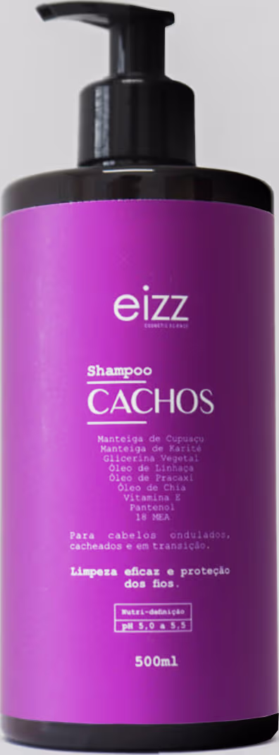 Shampoo para cabelos ondulados e cacheados. Eizz Cachos promove uma limpeza completa, sem agredir os fios.