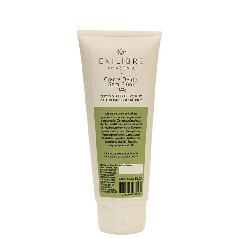 Creme dental sem flúor. Ekilibre Amazônia proporciona profunda limpeza sem agredir as papilas gustativas, sendo que a percepção de limpeza acontece já na primeira escovação. Por isso, é recomendado especialmente para pessoas que fazem uso de aparelhos ortodônticos, que possuem gengivas sensíveis ou que gostem de uma higiene bucal mais intensa.