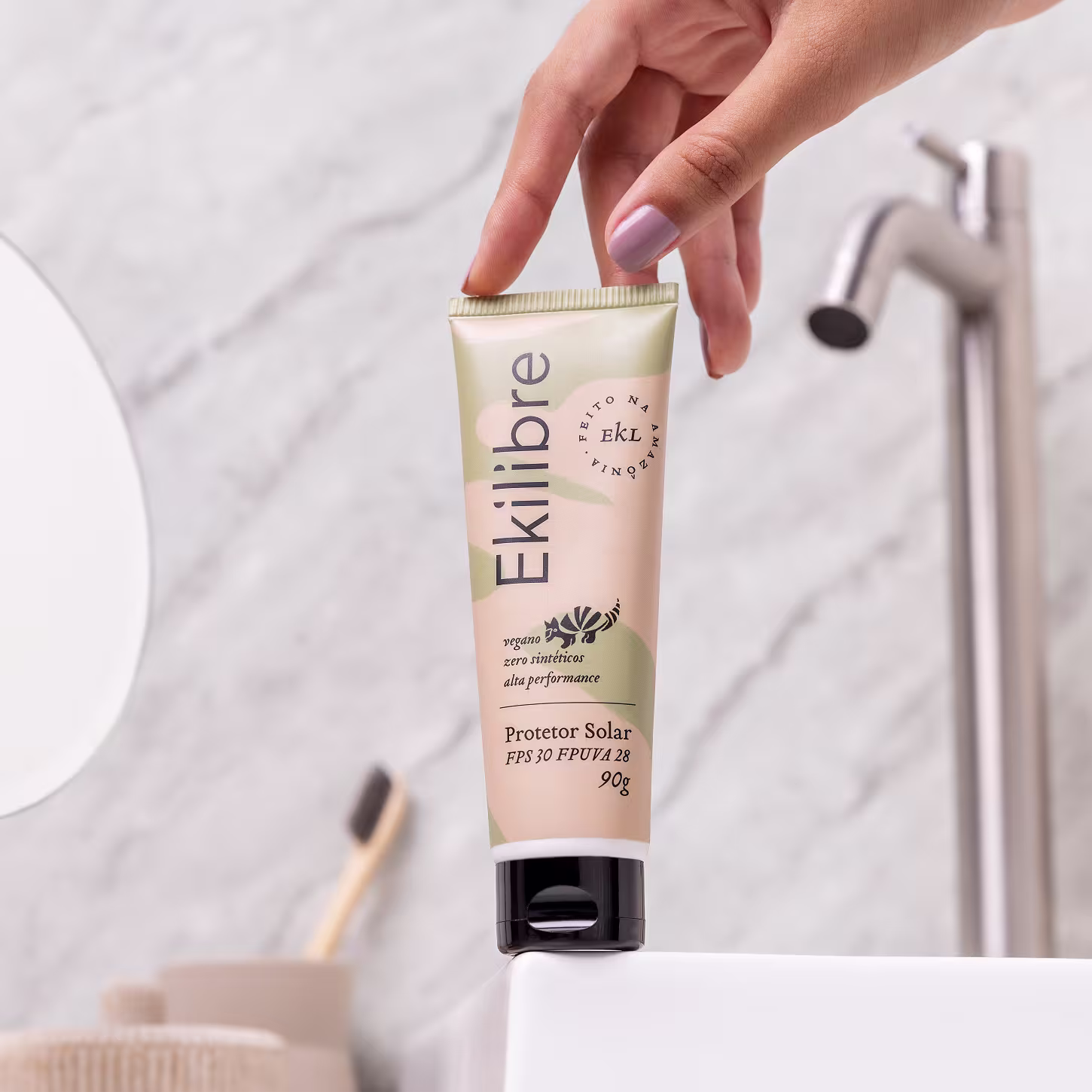 Protetor solar natural e vegano. Ekilibre Amazônia FPUVA 28 FPS 30 impede que pele sofra com os danos causados pelos raios UVA e UVB.
