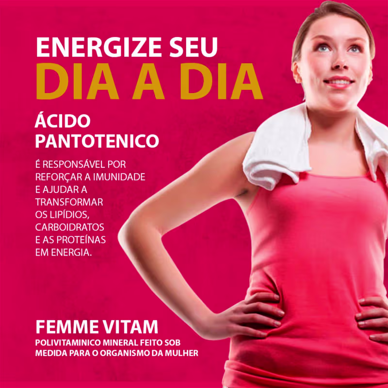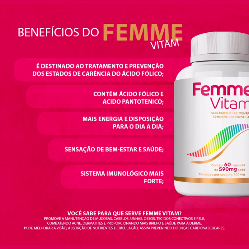 O Suplemento Vitamínico Ekobé Femme Vitam conta com fórmula avançada, rica em vitaminas A, C e E, além de colágeno, promovendo uma pele radiante e firme, combatendo os radicais livres e prevenindo o envelhecimento precoce. Com biotina e ácido fólico, este suplemento fortalece as unhas, evitando quebras e descamação. As vitaminas do complexo B convertem alimentos em energia, proporcionando disposição e combatendo a fadiga diária. Além disso, as vitaminas C e D fortalecem o sistema imunológico, aumentando a resistência contra doenças. Com a combinação única de vitaminas e minerais, Femme Vitam é ideal para o bom funcionamento do corpo, garantindo saúde e vitalidade.