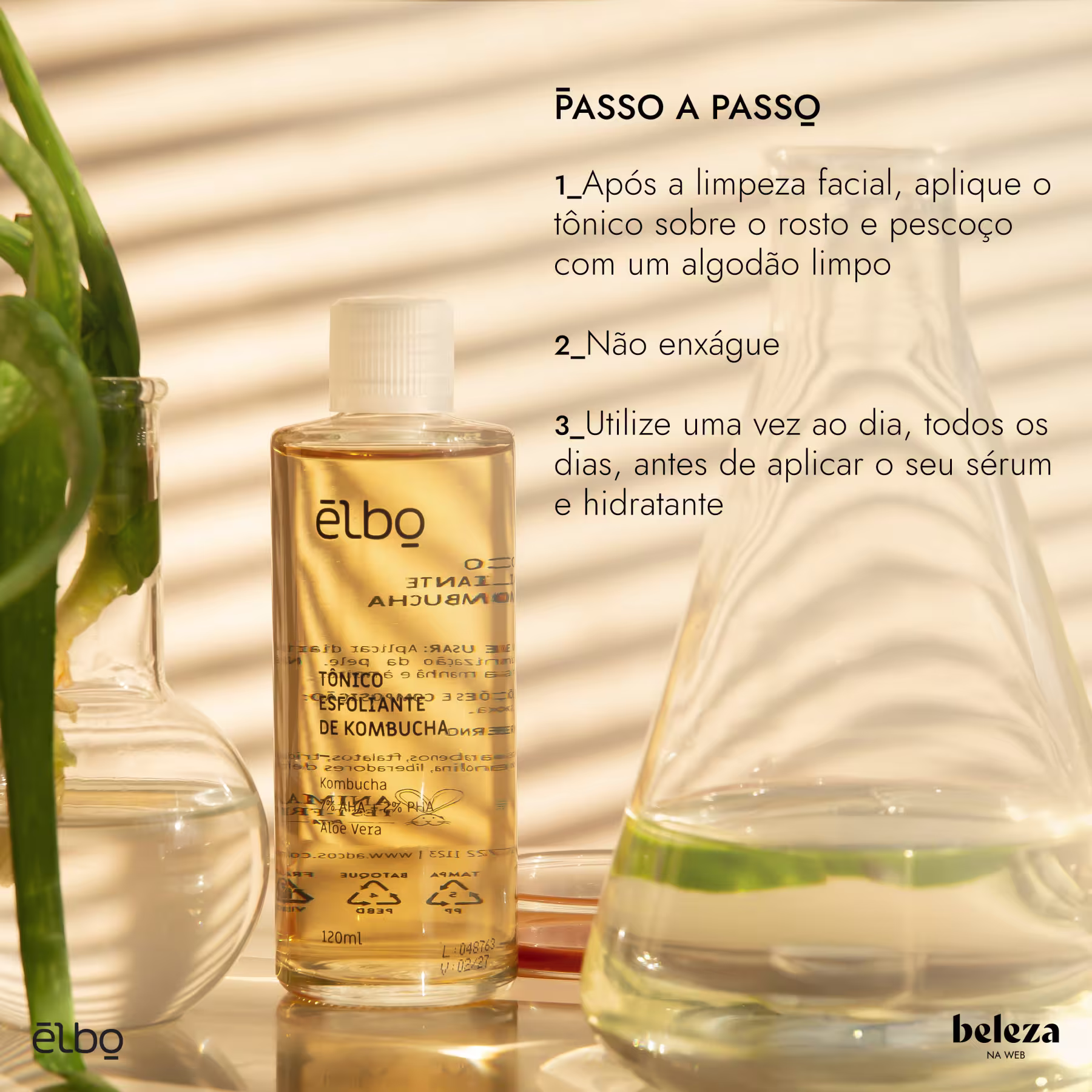 O Tônico Facial Esfoliante Elbo Kombucha é o passo ideal para preparar e ativar a pele, potencializando a ação dos ativos da sua rotina de skincare. Com uma associação exclusiva de alfa-hidroxiácidos (7%), polihidroxiácidos e kombucha, promove renovação celular e esfoliação diária suave, ajudando a desobstruir poros, melhorar a textura e o relevo da pele, controlar a oleosidade e equilibrar o pH. O resultado é uma pele mais luminosa, uniforme e pronta para absorver melhor os próximos cuidados.