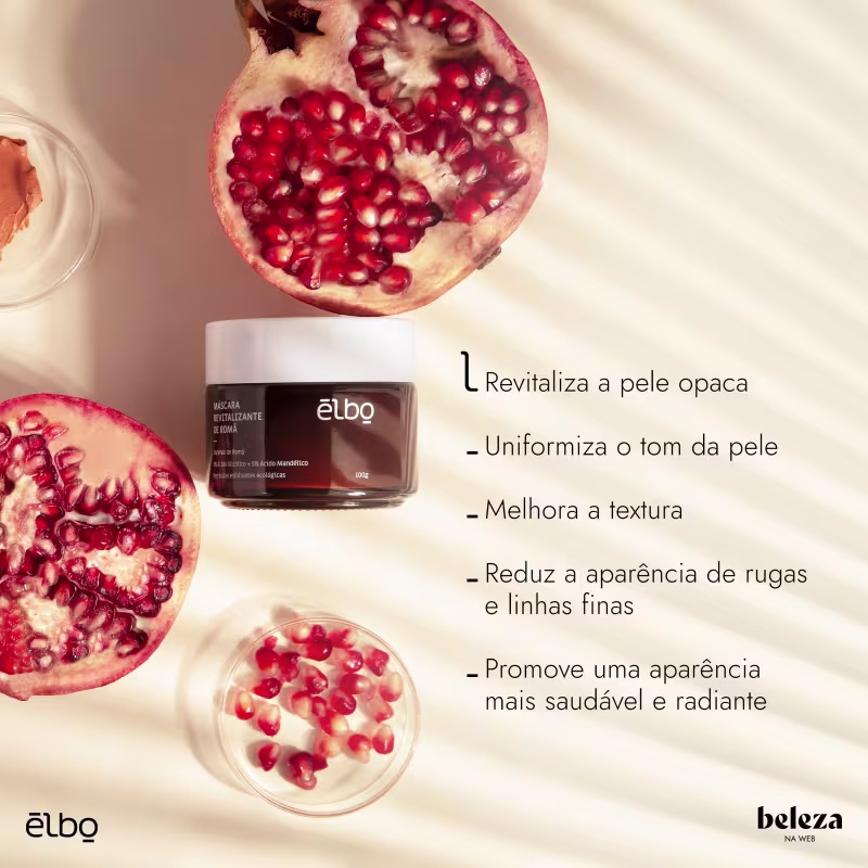 Máscara revitalizante de romã para todos os tipos de pele. Elbo Romã potencializa o viço e a luminosidade da face.