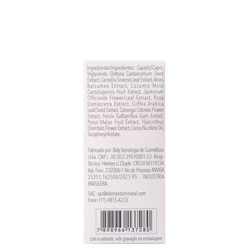 O Óleo Multifuncional Elemento Mineral Divine Oil conta com fórmula 100% natural e vegana, em uma solução elaborada com a alquimia moderna de 12 extratos botânicos bioativos - Coco, Jasmim, Rosas, Cardamomo, Gálbano, Maçã, Café, Chá Verde Melão, Bálsamo do Canadá, Jacinto e Ylang Ylang. Além disso, traz aroma suave que perfuma divinamente.