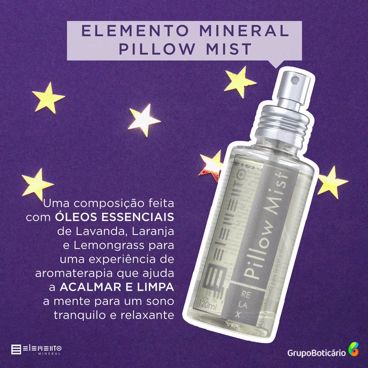 Elemento Mineral Pillow Mist é feito com um blend de óleos essenciais de Lavanda, Laranja doce e Lemongrass para uma experiência de aromaterapia que diminui a ansiedade e o ritmo cardíaco. Pode ser usado nas roupas de cama antes de dormir, em quartos de crianças e bebês e em outros ambientes para deixar um perfume suave e criar uma atmosfera com efeito relaxante.