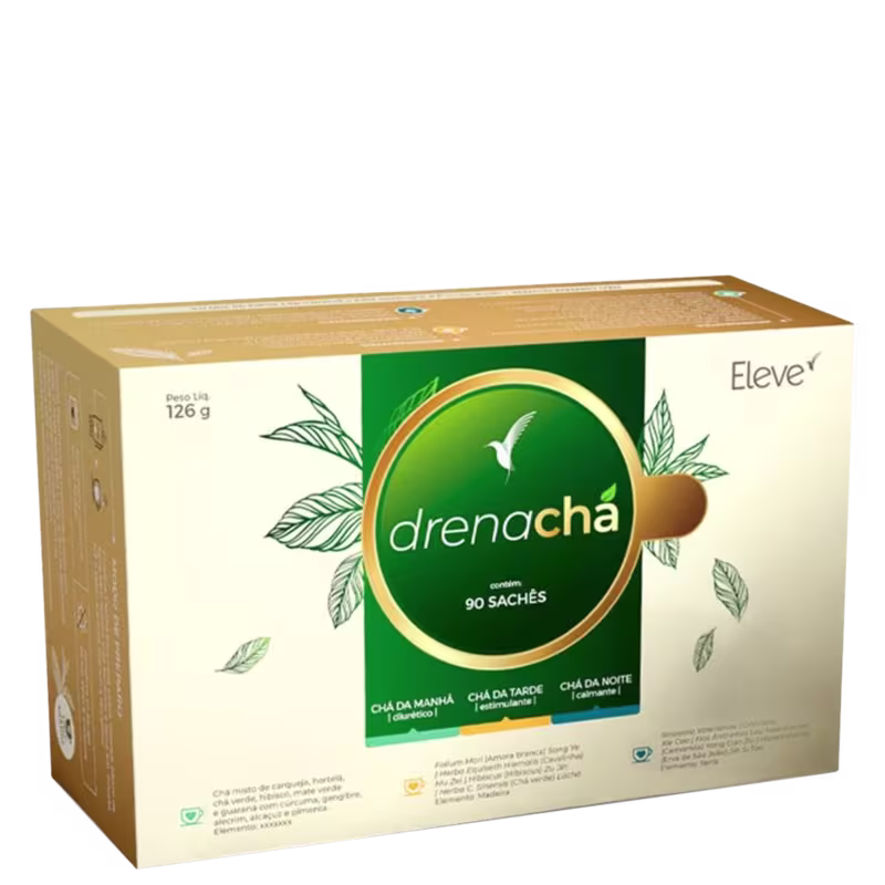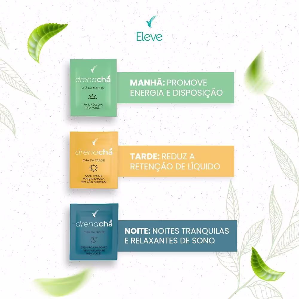 Chá. Eleve Life Drenachá vem dividido entre chás para manhã, tarde e noite, cada um proporcionando benefícios únicos para o seu dia.