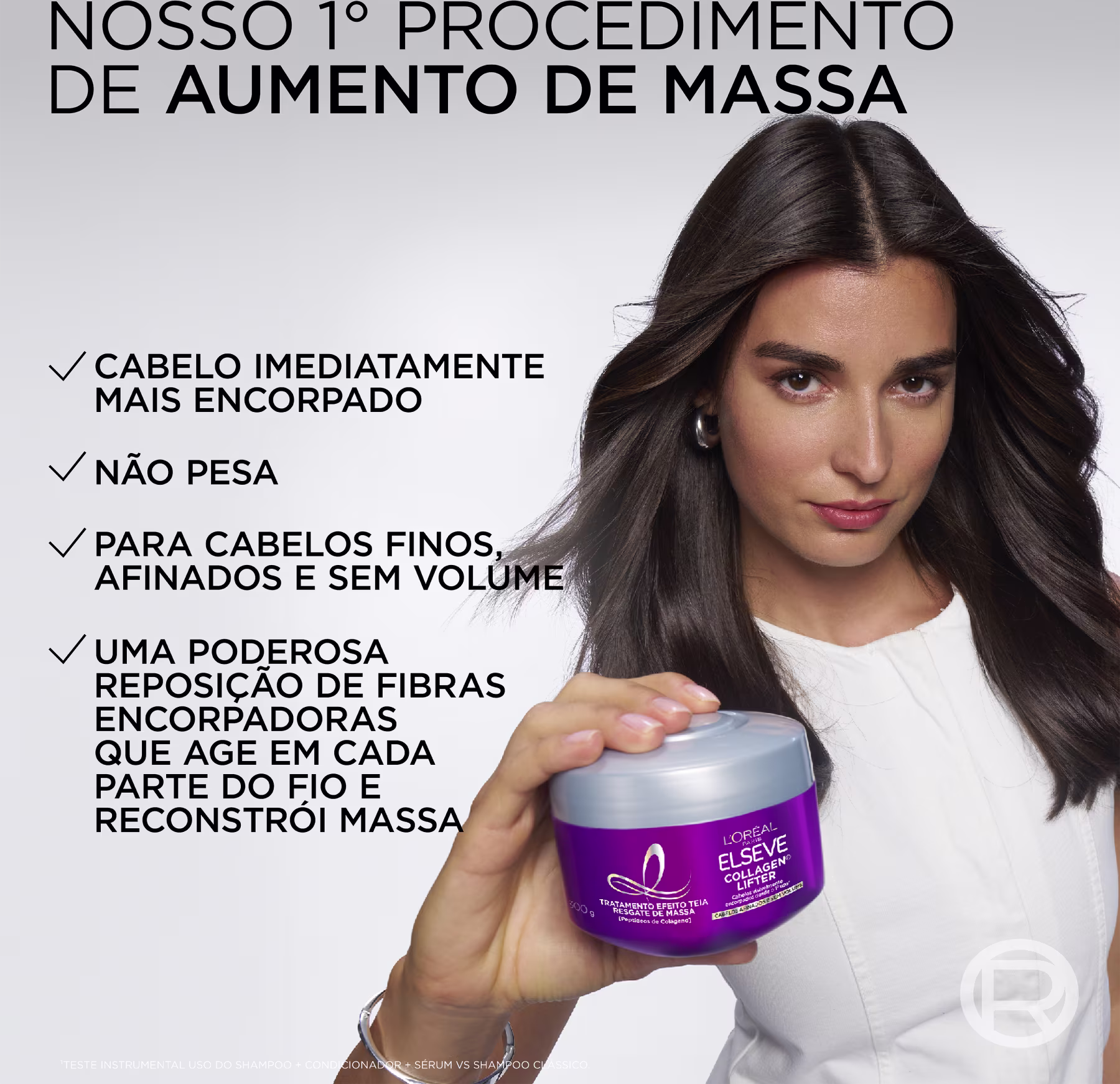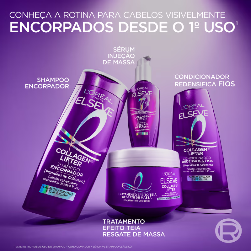 O Tratamento Condicionante Elseve Collagen® Lifter Efeito Teia Resgate de Massa é formulado com um complexo exclusivo de Peptídeos de Colágeno Vegetais, o produto mimetiza os peptídeos naturalmente encontrados na composição do colágeno, criando uma tecnologia de reconstrução capilar sofisticada. A fórmula promete restaurar a densidade dos fios, garantindo volume duradouro por até 72 horas, além de controlar a oleosidade e proporcionar maciez excepcional. Os Peptídeos de Colágeno Vegetais atuam como um verdadeiro resgate estrutural, reconstruindo cada segmento capilar e devolvendo vigor e elasticidade. O resultado é uma transformação visível nos cabelos, com aspecto mais encorpado, brilhante e saudável, sem adicionar peso excessivo.