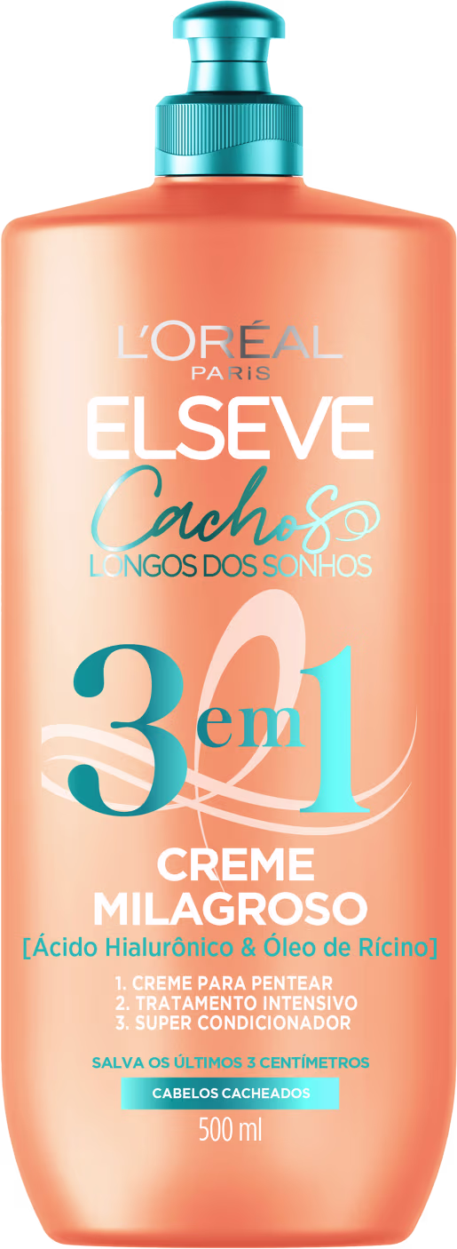 O Creme de Tratamento Elseve L'Oréal Paris Cachos Longos dos Sonhos 3 em 1 é um milagroso aliado cuja fórmula, com Óleo de Rícino e Ácido Hialurônico, nutre e sela os cachos até as pontas para salvar os últimos 3cm dos seus cachos.