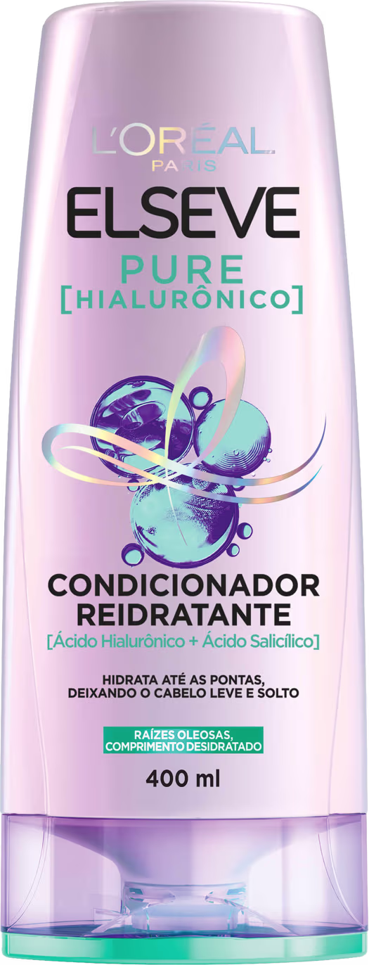 Condicionador para cabelos com raiz oleosa e pontas secas. Elseve L'Oréal Paris Pure Hialurônico purifica as raízes e hidrata intensamente a fibra capilar. Com a expertise da marca líder mundial, este condicionador utiliza o poder do Ácido Hialurônico e do Ácido Salicílico para devolver o nível ideal de hidratação sem pesar.