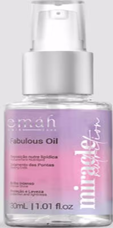 Não sei o CEPÓleo capilar restaurador. Emáh Hair Care Miracle Nutrition Fabulous Oil nutre, controla frizz, protege contra calor e proporciona brilho intenso aos fios.