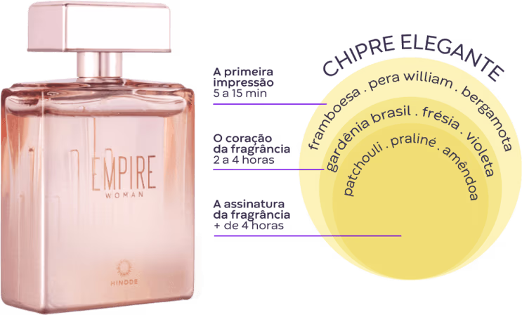 O Perfume Empire Woman, de Hinode, traz um aroma imponente com uma assinatura moderna e elegante. E foi criado para aquelas que inspiram através de suas conquistas ao alcançar seus sonhos. Nas notas de saída temos o frescor suculento e brilhante da Framboesa junto ao toque aquoso da Pêra. O corpo desta criação é assinado por um lindo e radiante buquê floral, trazendo a Gardênia Brasil como protagonista, uma flor poderosa e sedutora. Nas notas de fundo encontramos a força das madeiras e as notas adocicadas de Praline e Amêndoa, que envelopam esta estrutura de forma aditiva e envolvente.