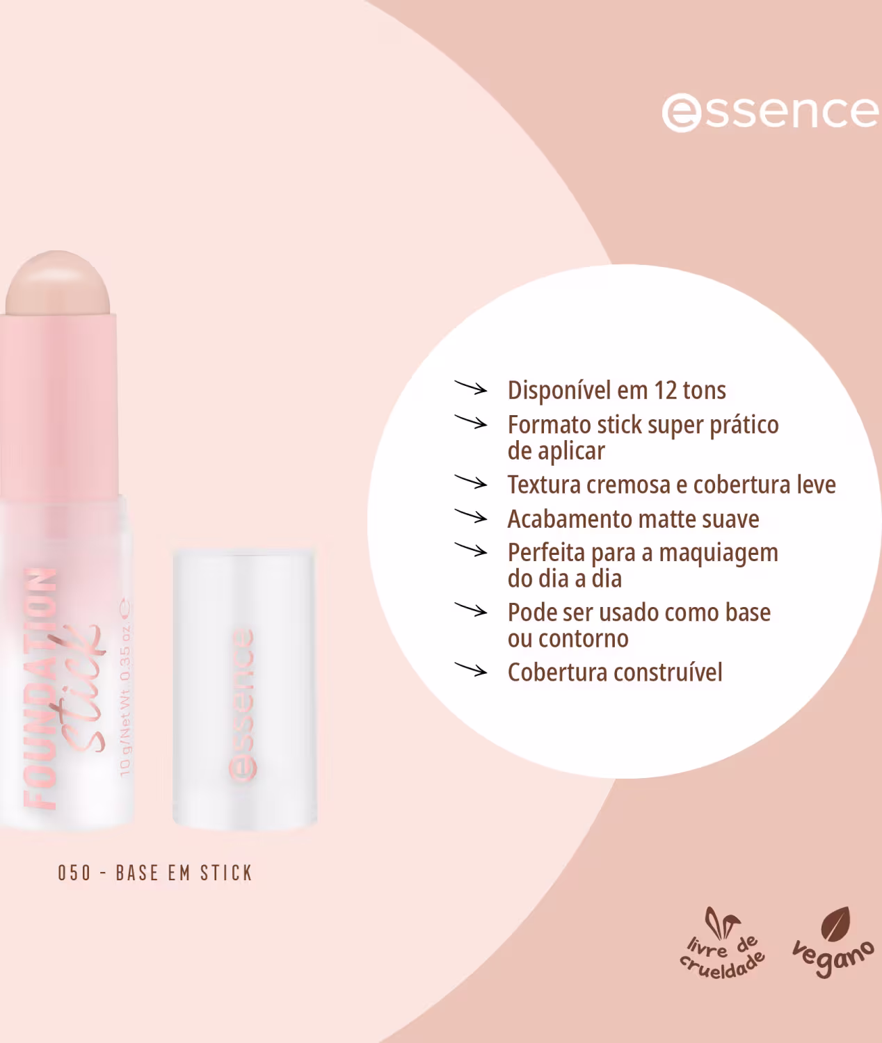 Base em bastão com acabamento matte natural. Essence Foundation Stick possui textura cremosa e cobertura leve construível, permitindo ajustar a intensidade desejada.