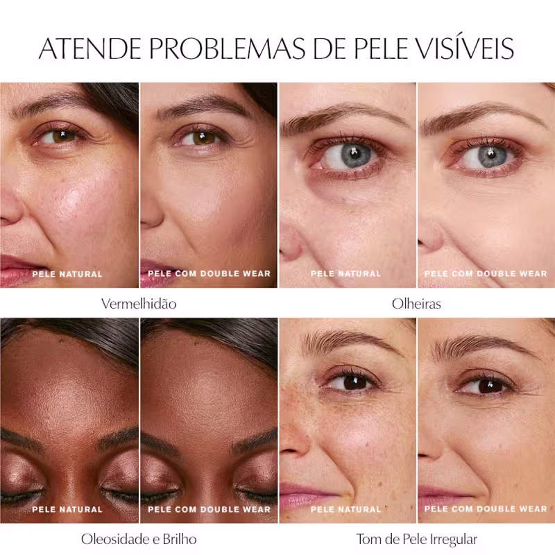 Base líquida de longa duração. Estée Lauder Double Wear com cobertura personalizável, controle de oleosidade e hidratação por 36h, textura leve e respirável.