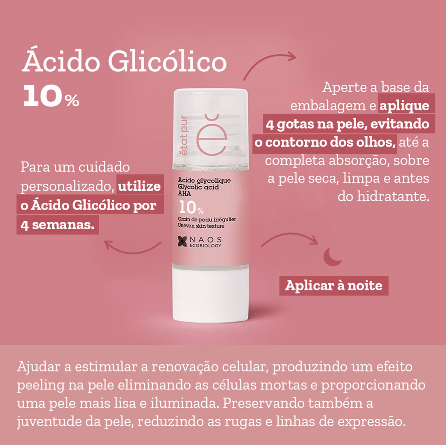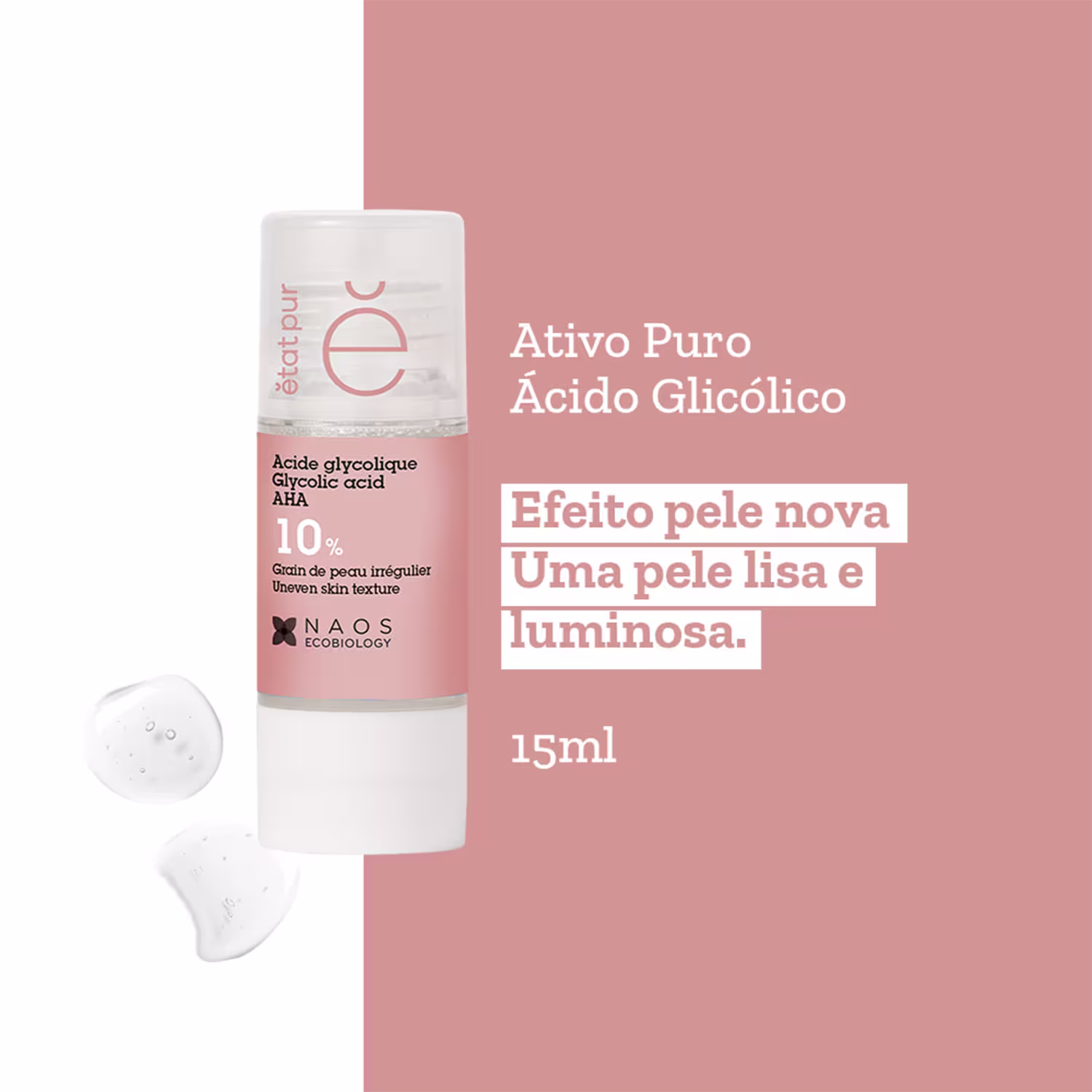 O Ativo Puro Etat Pur Ácido Glicólico 10% vem em tamanho molecular, o que confere um efeito peeling no rosto. Além disso, estimula a síntese de Colágeno, melhorando a textura da derme e amenizando as rugas e linhas finas.