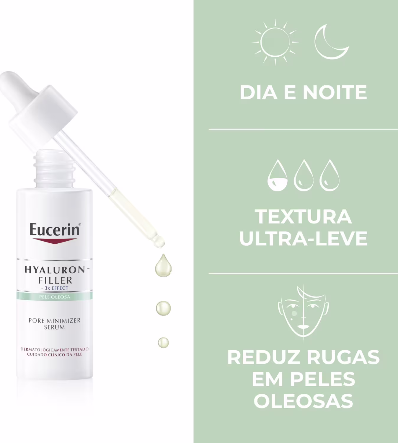 Auxiliando na redução dos poros visíveis ou aparentes do rosto, o Sérum Facial Eucerin Hyaluron Filler Pore Minimizer é indicado para peles oleosas com poros dilatados e com rugas, com as primeiras linhas de expressão e com textura da pele irregular, combatendo todos os sinais de envelhecimento.