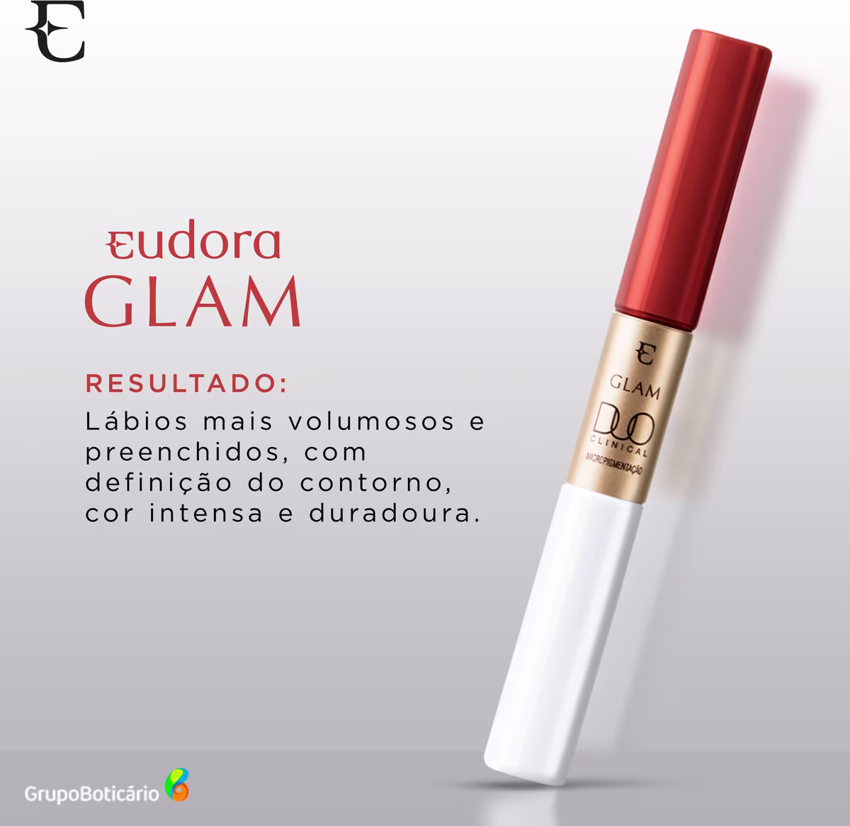Batom Líquido Eudora Glam Duo Clinical apresenta uma tecnologia exclusiva e fórmula com 8x mais Ácido Hialurônico, oferecendo efeito preenchedor lifting e micropigmentação labial. O resultado é um tratamento inovador que preenche e redefine o contorno dos lábios, promovendo mais firmeza e elasticidade.