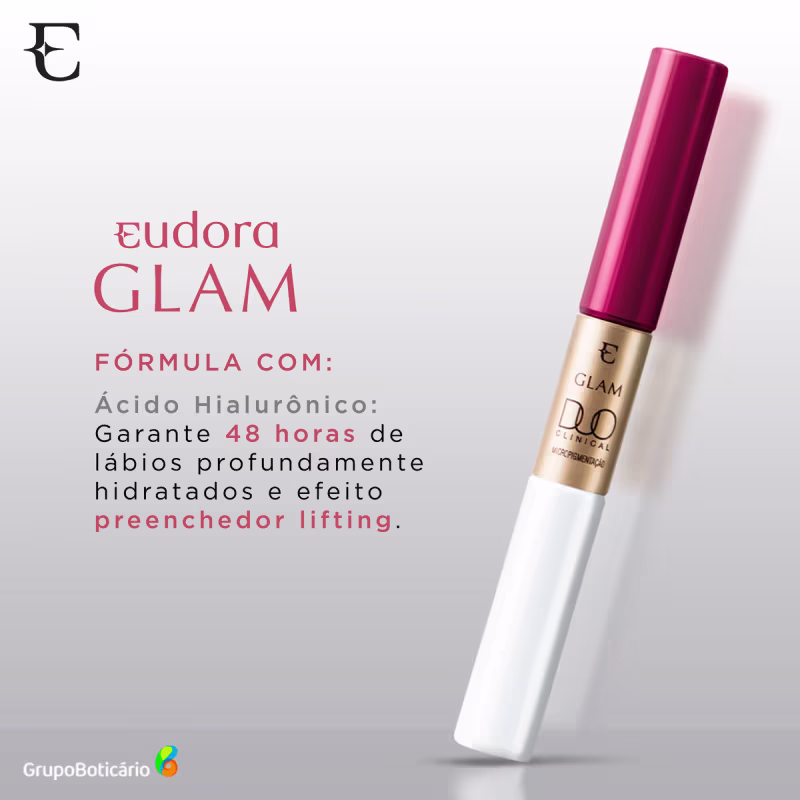 Batom Líquido Eudora Glam Duo Clinical apresenta uma tecnologia exclusiva e fórmula com 8x mais Ácido Hialurônico, oferecendo efeito preenchedor lifting e micropigmentação labial. O resultado é um tratamento inovador que preenche e redefine o contorno dos lábios, promovendo mais firmeza e elasticidade.