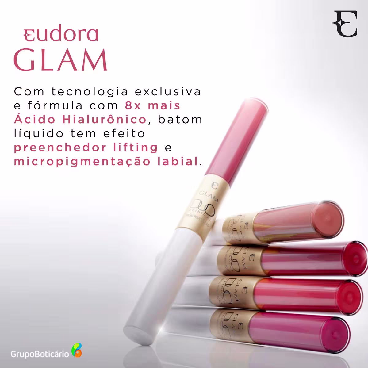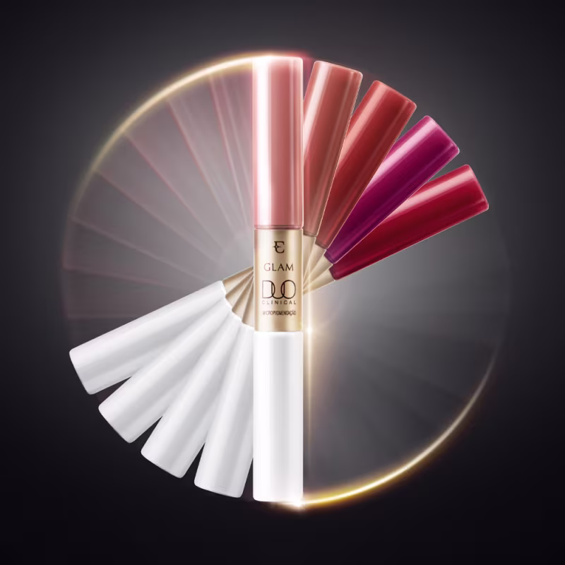Batom Líquido Eudora Glam Duo Clinical apresenta uma tecnologia exclusiva e fórmula com 8x mais Ácido Hialurônico, oferecendo efeito preenchedor lifting e micropigmentação labial. O resultado é um tratamento inovador que preenche e redefine o contorno dos lábios, promovendo mais firmeza e elasticidade.