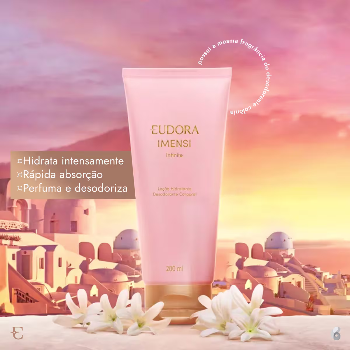 A Loção Hidratante Desodorante Corporal Eudora Imensi Infinite traz a mesma fragrância brilhante do desodorante colônia da linha, proporcionando hidratação por até 48 horas. Com fórmula de rápida absorção, deixa a pele macia, perfumada e desodorizada e sem sensação pegajosa.