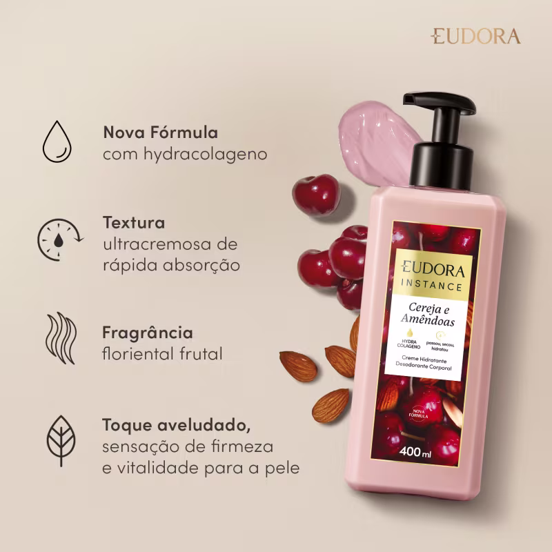 O Creme Hidratante Desodorante Corporal Eudora Instance Cereja e Amêndoa é um produto premium da linha de cuidados corporais Instance, desenvolvido para proporcionar hidratação intensa e prolongada com uma experiência sensorial única.
