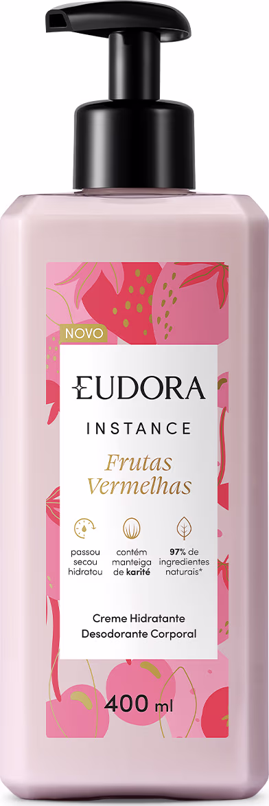 Creme hidratante desodorante corporal. Eudora Instance Frutas Vermelhas oferece hidratação profunda, maciez e fragrância encantadora.