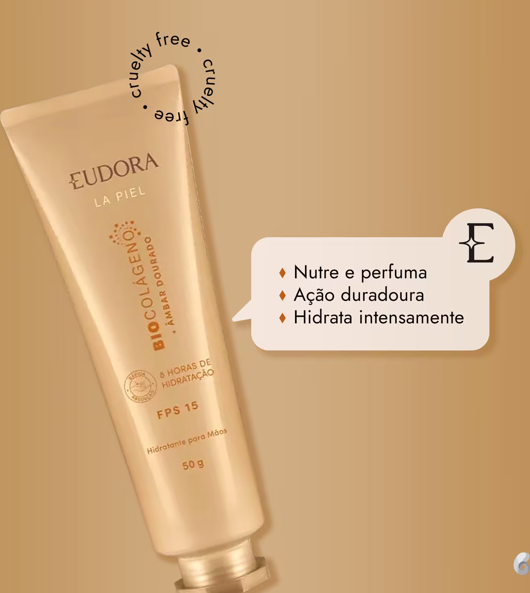 Creme hidratante para mãos. Eudora La Piel Âmbar Dourado FPS 15 deixa suas mãos lindas, nutridas e perfumadas, com ação duradoura de até 8 horas de hidratação intensa. Desenvolvido com a tecnologia do Biocolágeno que, associado com o Pantenol e Niacinamida, traz mais firmeza para a sua pele, além de hidratar mãos, unhas e cutículas por até 8 horas.