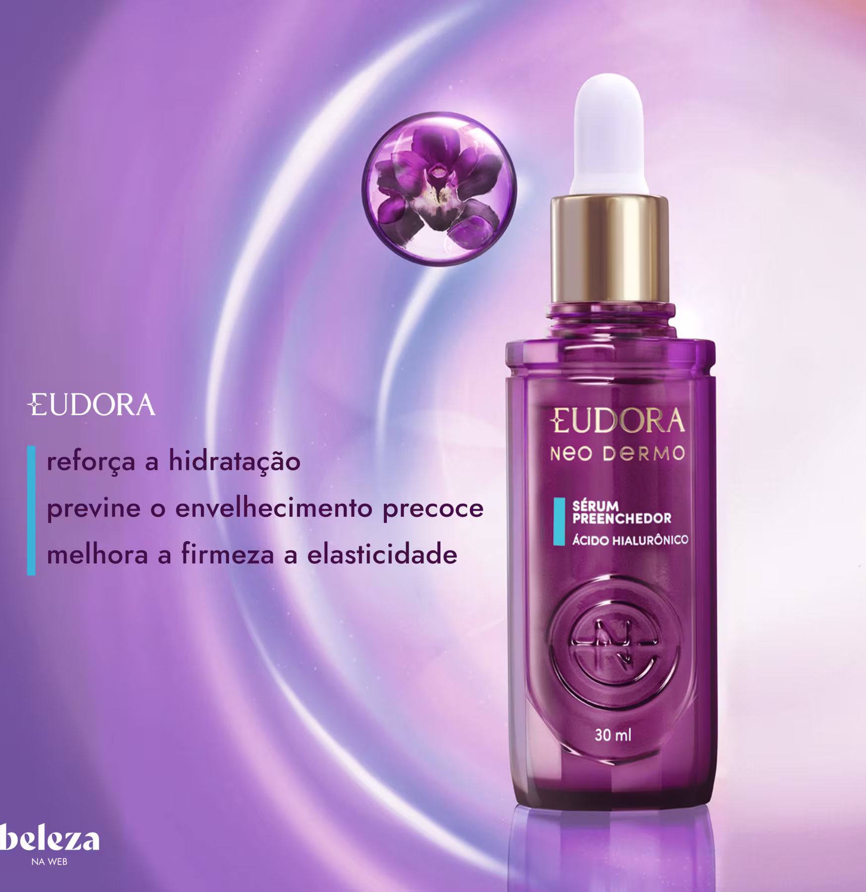 O Sérum Preenchedor Eudora Neo Dermo Active Pro Collection auxilia no processo de manutenção da hidratação, melhora a aparência da pele e previne a flacidez. Com ação preenchedora, Tecnologia ORCHISTEM™ e Ácido Hialurônico puro, esse sérum facial reduz e preenche rugas profundas e linhas de expressão em até 4 semanas.