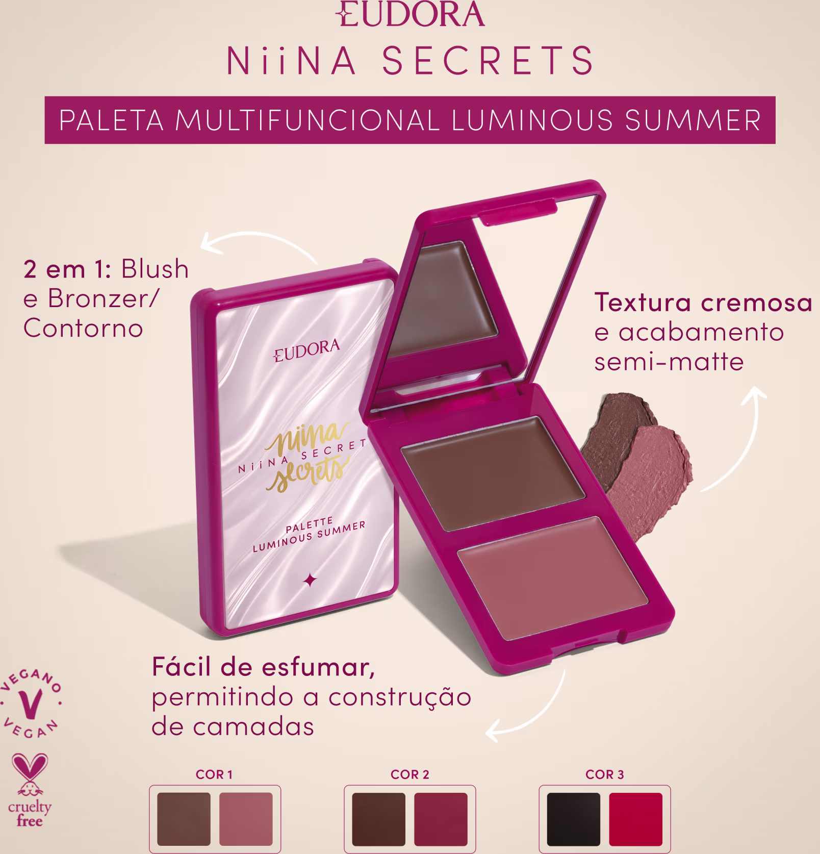 Paleta multifuncional. Eudora Niina Secrets Luminous Summer traz o duo de blush e bronzer/contorno cremosos para um glow que é a cara do verão.