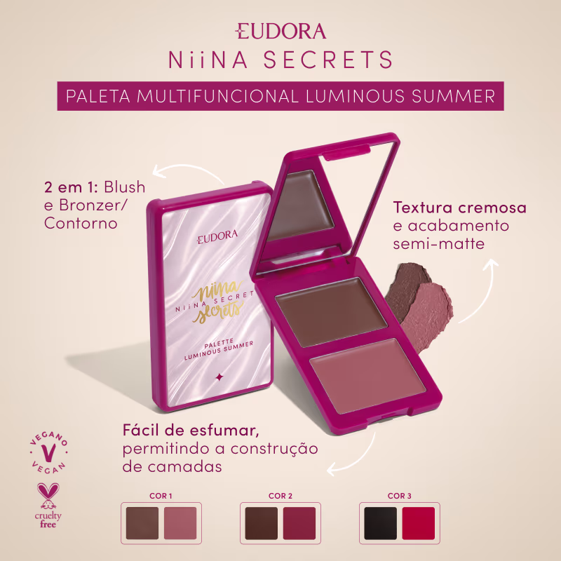 A Paleta Multifuncional Eudora Niina Secrets Luminous Summer foi desenvolvida para proporcionar um visual luminoso e natural em diferentes tons de pele, com uma fórmula cremosa de alta pigmentação. Os pigmentos deslizam suavemente sobre a pele, permitindo uma aplicação uniforme e fácil de esfumar. A textura semi-matte garante um acabamento sofisticado, realçando o viço natural da pele e criando um efeito de iluminação sutil.