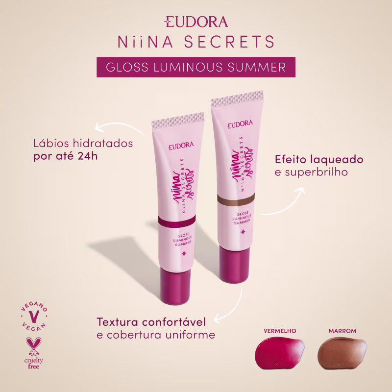 O Gloss Labial Eudora Niina Secrets Luminous Summer é o seu item essencial para um bocão sedutor, iluminado e irresistivelmente hidratado. Ele foi criado para realçar a sua beleza, proporcionando hidratação e conforto incomparáveis. A textura é levinha, desliza fácil, ideal para criar um look ousado e sofisticado.