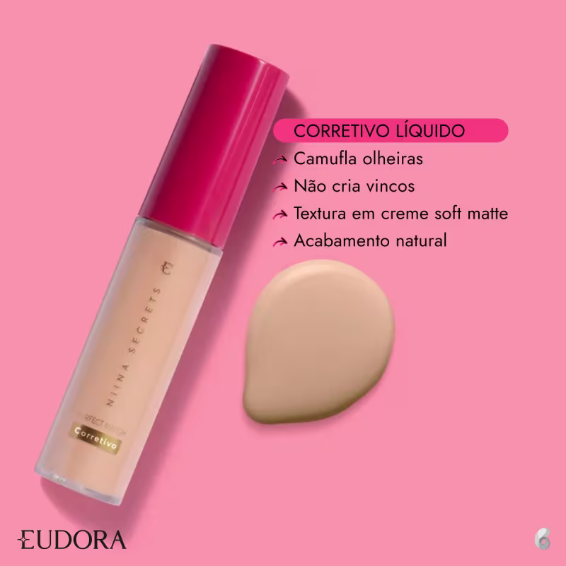 Corretivo Líquido Eudora Niina Secrets Perfect Match com 12h de cobertura e toque aveludado. Melhores maquiagens Eudora Niina Secrets na BLZ. Ver mais ❯