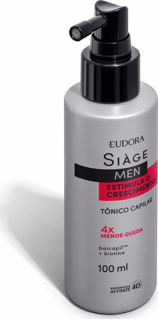 O Tônico Capilar Eudora Siàge Men Estimula o Crescimento¹ age diretamente no couro cabeludo para promover fios fortes e resistentes². Sua fórmula com Baicapil e Biotina entrega um tratamento eficaz contra a queda de cabelo, para fios fortes e resistentes; além de estimular o crescimento de novos fios em apenas 30 dias de uso contínuo.
