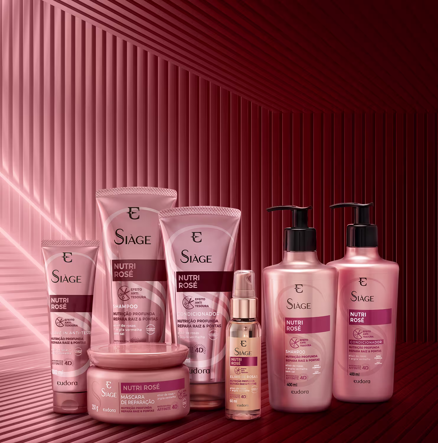 Condicionador para cabelos danificados. Eudora Siàge Nutri Rosé proporciona maciez, brilho e nutrição profunda aos fios, sem pesar.