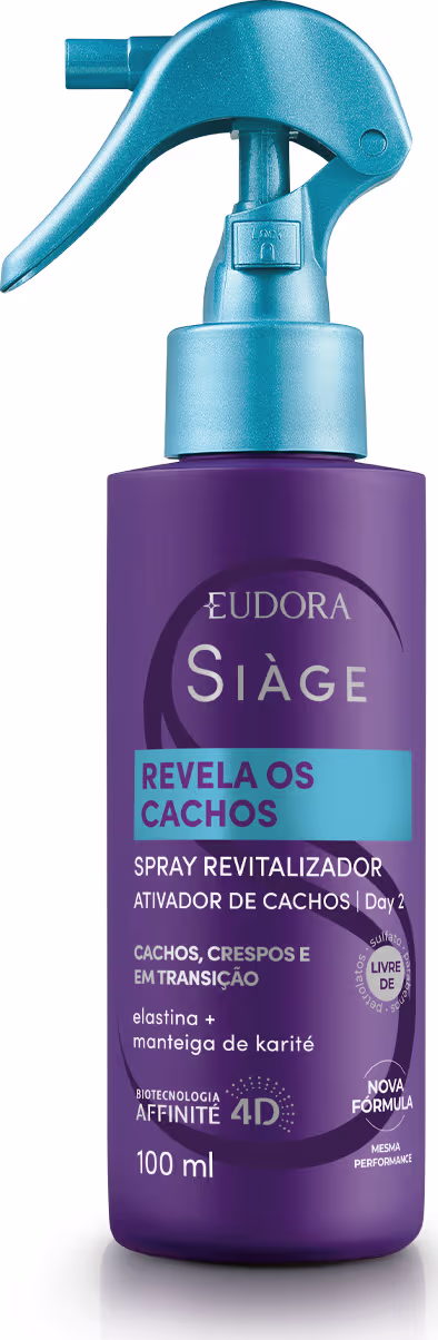 O Spray Revitalizador Eudora Siàge Revela os Cachos ajuda a recuperar a definição dos cachos perdida entre as lavagens. Sua fórmula possui tecnologia detectora de danos, que trata os fios até a camada mais profunda. Com efeito memória, define novamente os cachos por até 24hs. Facilita a remodelagem, devolve o balanço natural e elimina o excesso de frizz.