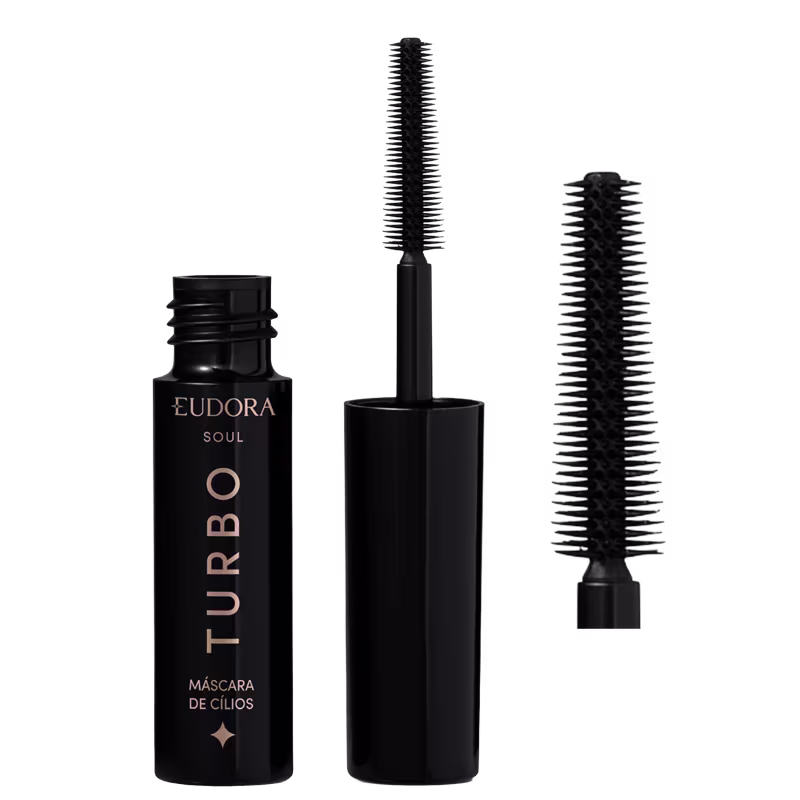 Máscara de cílios preta. Eudora Soul Turbo garante cílios turbinados com 7 benefícios em um único produto, incluindo volume intenso, definição extrema e curvatura poderosa para um olhar marcante.