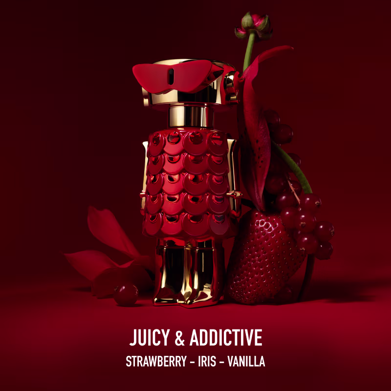 O Perfume Fame In Love Elixir, de Rabanne, apresenta-se como a assinatura feminina mais deliciosa e intensa já criada pela marca. O grande protagonista desta fragrância é o extrato de morango super suculento, que injeta uma dose de diversão e desejo ao perfume, transformando o espírito da it-girl parisiense em uma nova e magnética linguagem do amor.